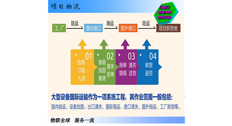 大型设备国际运输作为一项系统工程,其作业范围一般包括:国内陆运、设备加固、出口清关、国际海运、进口清关、国外陆运、工厂卸货等。